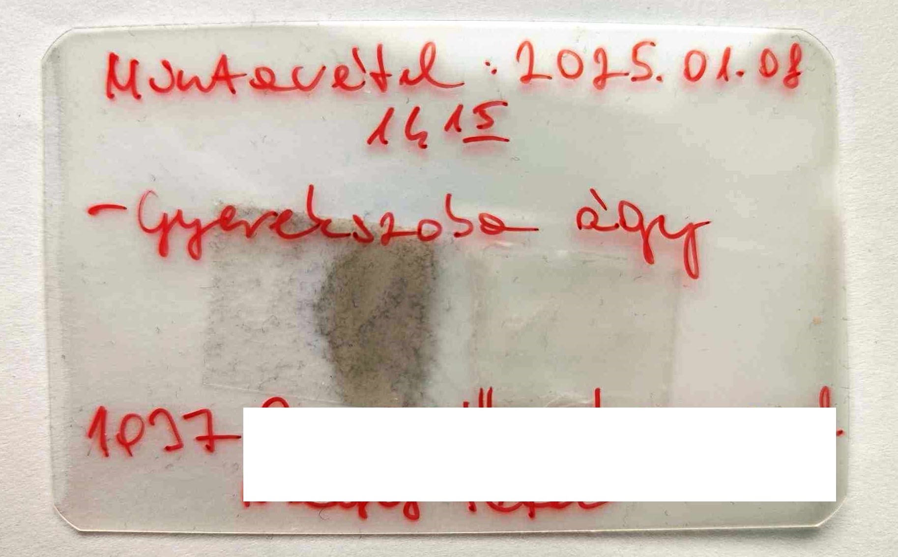 A fotón egy gyerekágyból levett mintát látsz. Miért vettünk mintát? Tudjuk, hogy összefüggés van a gyerekeket és felnőtteket egyaránt érintő betegségekben a penészedés és a házipor-atkák számát illetően. Szénanátha (allergiás rhinitis), allergia, asztma, túlérzékenységi tüdőgyulladás (hiperszenzitiv pneumonitisz), aspergillósis, bronchopulmonáris aspergillosis, orrmelléküreg-gyulladás (rhinosinusitis), légúti fertőzések, orrdugulás, váladékozás, köhögés, orrfolyás, fejfájás, részleges szaglásvesztés, ekcéma, csecsemőkori ekcéma (atópiás dermatitisz) stb. Azt kerestük, hogy a család tüneteit mi okozza, így mintát vettünk az egyes bútorok, játékok, szőnyegek, stb. felületéről a laboratóriumi vizsgálatok elvégzéséhez.